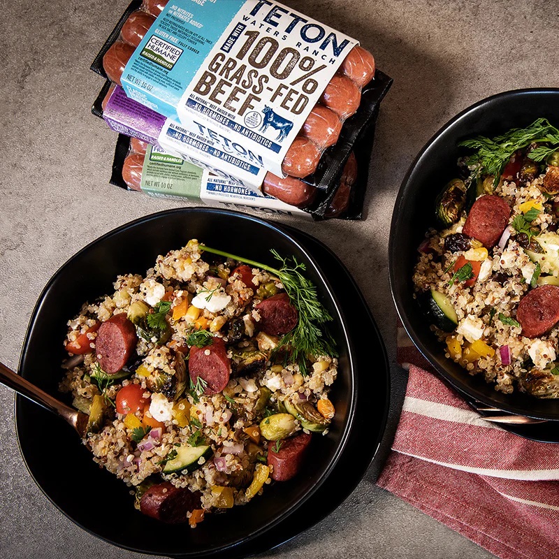 Our friends at Teton Waters Ranch created this light and nutritious summer quinoa salad using our organic beef bone broth to cook the quinoa (a.k.a the BEST was to cook any grain) and incorporated roasted summer vegetables and grass-fed beef sausage. This is the perfect side dish to bring to any BBQ this summer!